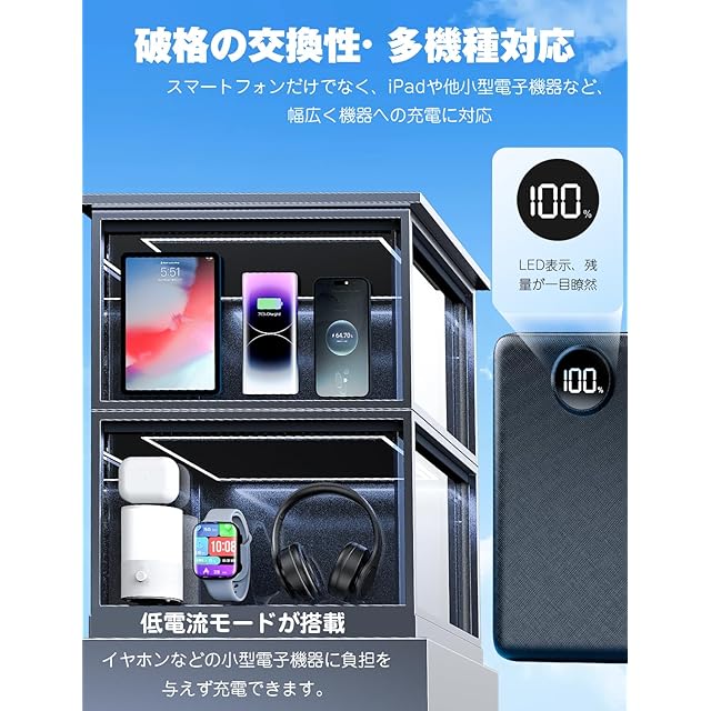 【LED電池残量表示・自動検知IC機能】 本体にLED液晶ディスプレイを搭載しており、残量を1%刻みで表示できるので、ボタンを押すと電池残量が一目で確認できます。充電のタイミングを把握するのに便利で、使うときにバッテリーの残量が無いといった不安を解消します。独自技術Smart IC知能検知機能により、接続されたデバイスに合わせて自動的に出力を判別してパワーの調整を行い、充電が完了したら自動でストップ、異なるデバイスでも安全かつ効率的な充電が可能になります。また、低電流モードも搭載されており、ワイヤレスイヤホンやスマートウォッチなどの小型電子機器を充電する際に、適切な出力を自動的に変えることができます。小型電子機器に負担を与えず、より安全に充電できます。(※低電流モードのon / offの詳細は説明書をご覧ください。)