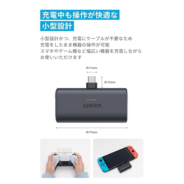 コンパクトかつパワフル:コンパクト設計ながらスマホ約1回分の5000mAhの容量と最大22.5Wの出力を実現。コンパクトさとパワフルさを兼ね備えています。