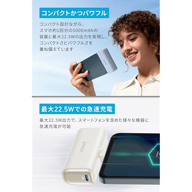 コンパクトかつパワフル:コンパクト設計ながらスマホ約1回分の5000mAhの容量と最大22.5Wの出力を実現。コンパクトさとパワフルさを兼ね備えています。