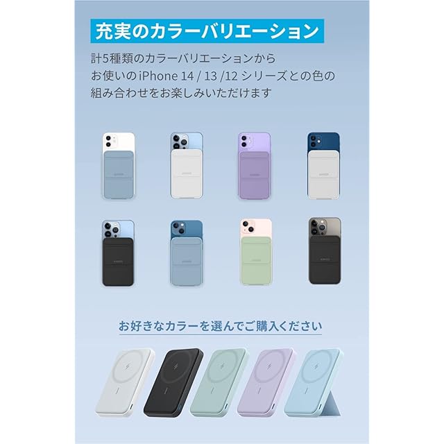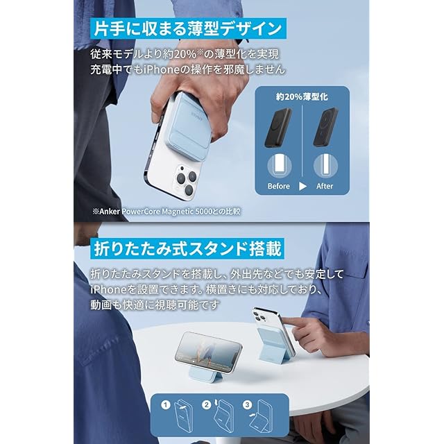 コンパクトながらパワフル:薄さわずか12.8mmのすっきりとしたスリムなデザインで、片手で通話や自撮りなどを楽しめます。超コンパクト設計ながら、5000mAhの容量かつ7.5W出力でiPhone 14 / 13 / 12シリーズへ約1回充電が可能です。※iPhone 14 / 14 Plus / 14 Pro / 14 Pro Max / 13 / iPhone 13 Pro / 13 Pro Max への満充電回数は1回未満になります (Anker調べ) 。
