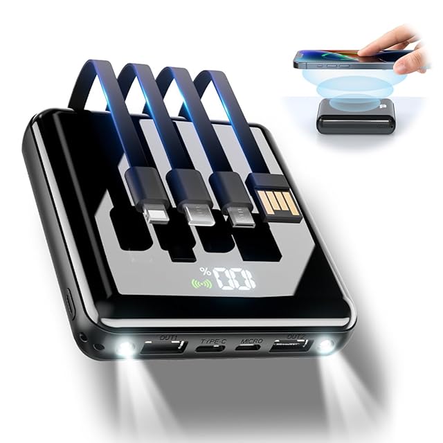 【6台同時充電可能 &4本ケーブル内蔵&ワイヤレス充電】出力にはUSB-A ×2ポートと3規格のケーブル内蔵とワイヤレスで6台同時に充電可能です。入力にも充電ケーブル内蔵と蓄電用microポートと蓄電用Type-Cポートの3つ選択肢があり、お持ち運びが便利になります。出力にはmicroUSB、USB type-Cなど3規格出力ケーブルが内蔵された最新型のケーブル内蔵モバイルバッテリーです。専用ケーブルを持ち歩く必要がなく、各種タイプのデバイスにも対応出来ます。更に、モバイルバッテリーの本体に充電ケーブルが内蔵されているため、コンセントのある場所であれば即時充電が可能。