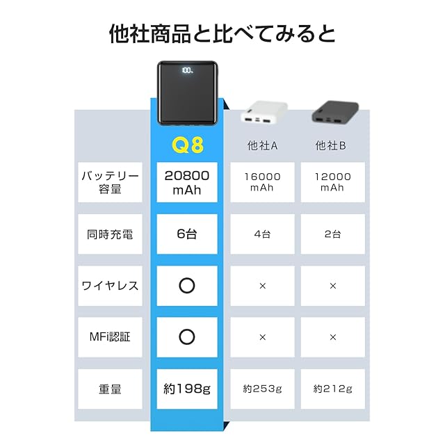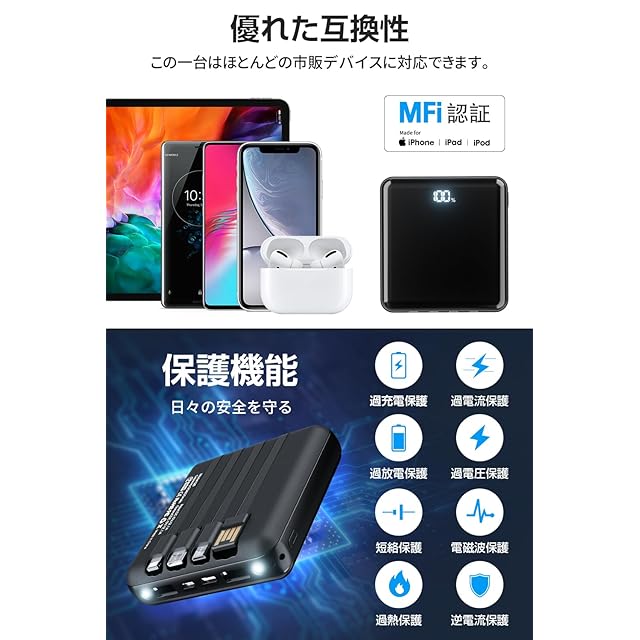 商品名:モバイルバッテリー 軽量 大容量 20800mAh【 MFi認証& 4ケーブル内蔵】 ワイヤレス充電対応 3Way蓄電 急速充電 携帯充電器 6台同時充電 Type-C コンパクト LED残量表示 回路保護 機内持ち込み可能 PSE認証済 旅行/出張/アウトドア/防災/地震/停電対策などの必携品 iPhone/iPad/Android各種スマホ対応