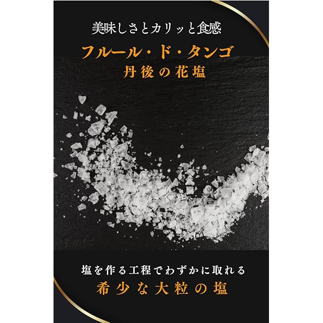 ✅【カリッとした食感が特徴の塩】この自然塩の生産地である丹後地方は、高い品質で知られる絹織物『丹後ちりめん』の産地でもあります。この海塩も職人が丁寧に不純物を取り除くことによって、実現された絹のような白さと見た目にも美しい天然塩(自然塩)です。 フルール・ド・タンゴは、塩作りの際に少しだけ出来る希少な大粒の結晶が特徴の塩の花とも言われるお塩( フルールドセル )です。