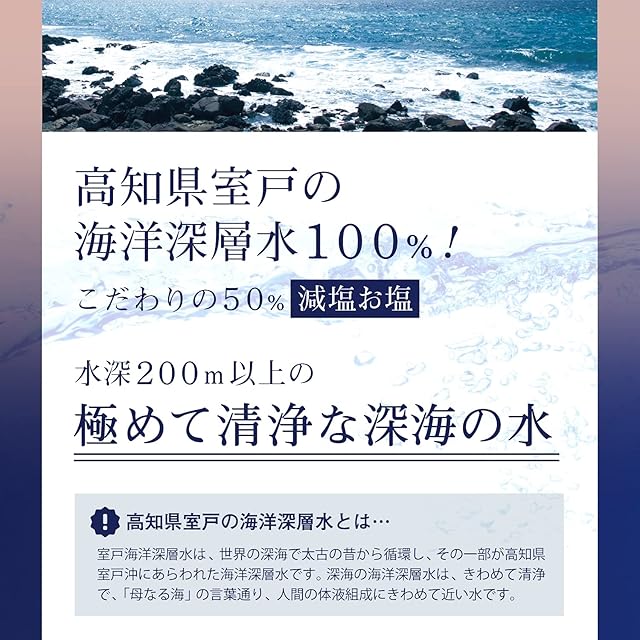 ●高知県室戸の海洋深層水100%の減塩お塩 室戸海洋深層水は、世界の深海で太古の昔から循環し、その一部が高知県室戸沖で湧昇流(ゆうしょうりゅう)となってあらわれた海洋深層水です。 深海の海洋深層水は、きわめて清浄で、「母なる海」の言葉通り、人間の体液組成にきわめて近い水。 高知県室戸の水深200m以上の深海から汲み上げた不純物の少ない綺麗な海水を100%使用しています。