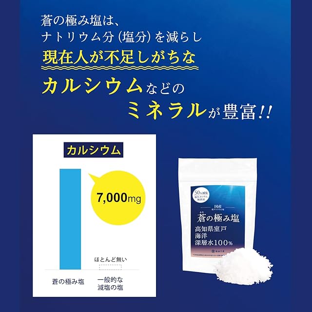 ●安心の国内製造 原材料だけでなく、製造所も国産にこだわっています。 ●お味 お味は、一般的な減塩の塩と比較して、優しく自然のまろやかなお味です。 また海洋深層水の天然の「にがり」のミネラルが豊富な為、少し苦味が感じる事があります。 「苦味」はうま味の5大要素の1つです。 天然の複雑な苦味が料理のうま味に大変身。 お肉やお魚料理におすすめです。 *おすすめの食べ方 ・お肉や魚料理などにもよく合います。 (サラダや野菜料理に使うと天然のにがり成分で苦味を感じる事があります) ●【栄養成分】100gあたり エネルギー・・・0kcal たんぱく質・・・0g 脂質・・・0g 炭水化物・・・0g 食塩相当量・・・45.0g マグネシウム・・・4,400mg カルシウム・・・7,000mg カリウム・・・1,000~4,000mg ●小さじ1杯(4g)当たり 食塩相当量・・・1.8g カリウム・・・0.04~0.16g