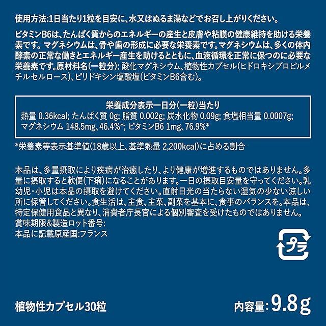 原材料(一粒分) 海水由来の酸化マグネシウム(マグネシウム:148.5 mg、46.4%*)、植物性カプセル(ヒドロキシプロピルメチルセルロース)、ピリドキシン塩酸塩(ビタミンB6:1 mg、76.9%*)。*栄養素等表示基準値(18歳以上、基準熱量2,200kcal)に占める割合