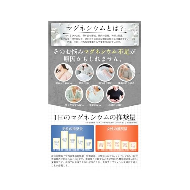 ✅【栄養機能食品( Mg )】マグネシウムは、骨や歯の形成に必要な栄養素です。マグネシウムは、多くの体内酵素の正常な働きとエネルギー産生を助けるとともに、血液循環を正常に保つのに必要な栄養素です。