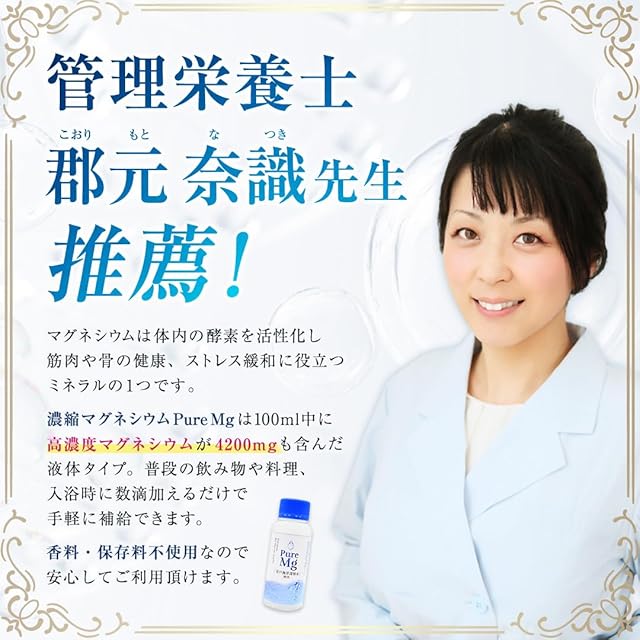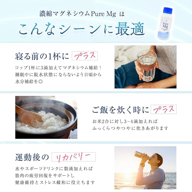 ✅簡単にミネラルを補給: 「Pure Mg にがりエッセンス」は液体タイプで、日常の飲み物に手軽に加えることができます。コーヒー、お茶、水、お味噌汁などの飲み物に本品を数滴ほどを加えるだけで、マグネシウムを補給することができます。