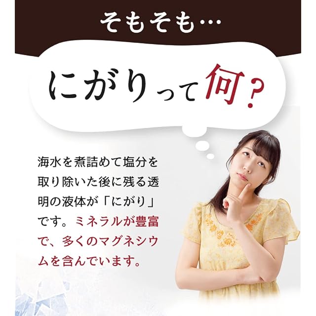 にがりの使い方:豊富なミネラルがありますのでにがり化粧水としてもご使用できます。ピーリング(角質)にも使用でき、自宅でにがりエステが簡単にできます。ご飯ににがりを混ぜて炊くことで、いつものご飯がおいしく、ふくっらとつやのある炊き上がりに。から揚げ、カレー、ビーフシチューやお味噌汁など様々なお料理ににがりを加えることで素材の味を引き立たせます。煮物に使うことで煮崩れを防ぎ、お肉をやわらかくしてくれるので、ワンランク上のお料理に。にがりを混ぜたお水で家庭菜園の野菜や植物がおいしく元気に育ちます。