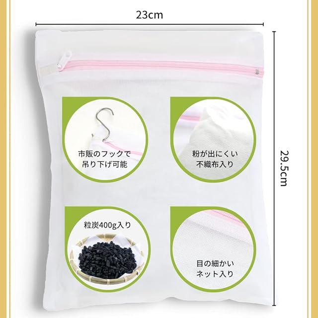 竹炭の粒がお湯の中の塩素(カルキ)や炭酸ガス、トリハロメタンなどを吸収して、お肌への刺激が少なくなります。乾燥肌の方にとってもお肌の刺激がとてもマイルドになります。また、水の分子の集まり(クラスター)が竹炭の微細官を通ることでより小さなクラスターに分解され、水の分子が細かくなるので、お湯が滑らかになります。身体の芯まで温まり、湯冷めしにくくなります。竹炭の汚れを吸着する効果によってお風呂のお湯が汚れにくくなります。浴槽を清潔に保ち、お風呂掃除が簡単になります。ご使用前に3、4回程度、軽く水洗いをしてください。最初のころは入浴の際に少し炭の粉が出ますが、使っているうちに出なくなります。ご使用後は軽く洗って水を切り、ときどき天日干しをしてください。約半年間使用できます