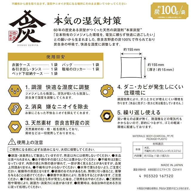 吸湿と放湿をくり返し、炭自身で湿度を調整してくれます、くり返し使えるので経済的です