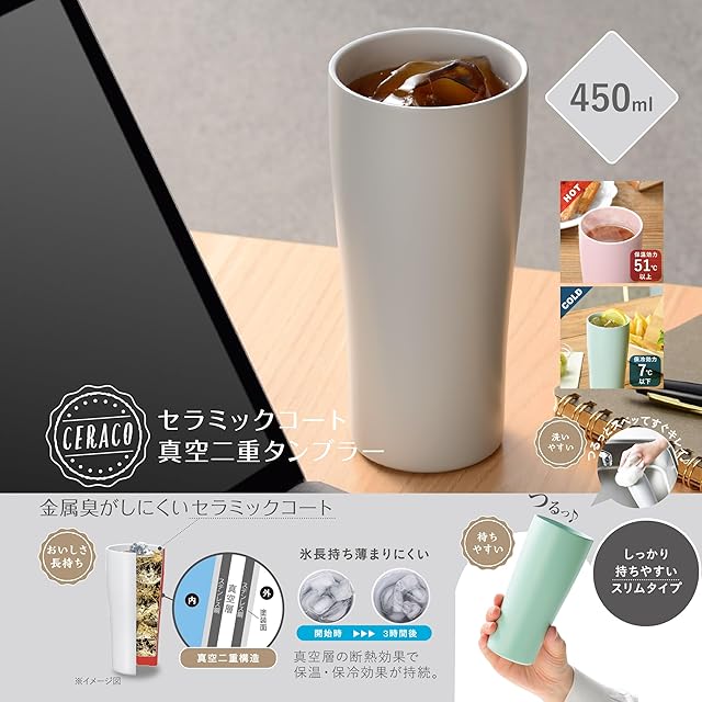 カクセー(Kakusee) タンブラー グレー 450ml 真空二重構造 保温 保冷 スリムタイプ セラミックコート 洗いやすい セラコ CE-01C