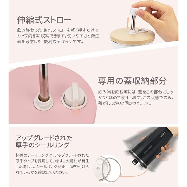 伸縮ストローと簡単清掃:このタンブラーには、使わないときに吸管を押し込んで収納できる伸縮式ストローが搭載されています。ストローとフタは取り外して洗浄可能で、清潔に保てます。吸管口には2つのキャップ(1つ予備キャップ)が付いており、漏れ防止ができます。さらに、専用の吸管ブラシが付属しており、隅々までしっかり清掃できます。日常使いやオフィス、アウトドアに便利なタンブラーです。