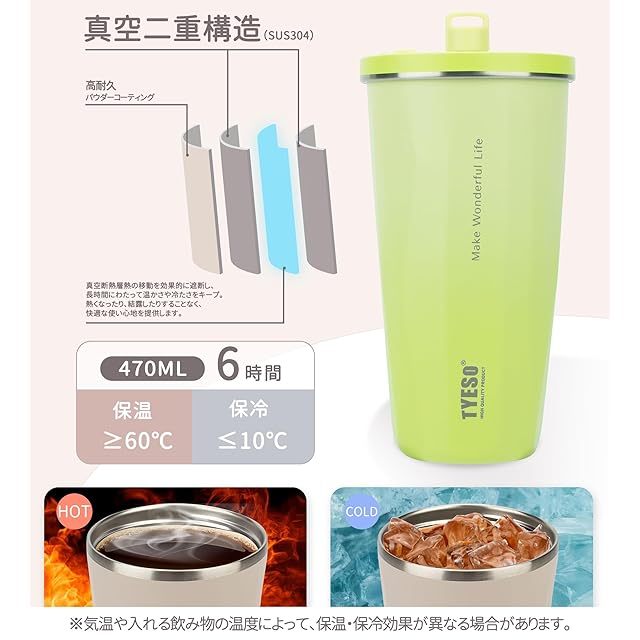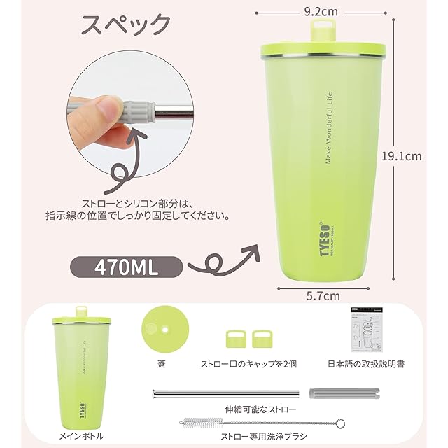 商品名:【SNSで話題】TYESO タンブラー ストロー付き 470ml ステンレス 蓋付き 真空断熱 保温 保冷 アウトドア 持ち運び便利 直飲み 漏れない 大容量 多色 トラベル 2025年アップグレード版