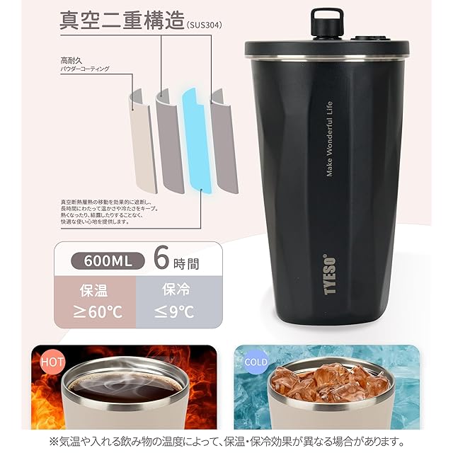 商品名:【SNSで話題】TYESO タンブラー ストロー付き 600ml ステンレス 蓋付き 真空断熱 保温 保冷 アウトドア 持ち運び便利 直飲み 漏れない 大容量 多色 トラベル 2025年アップグレード版