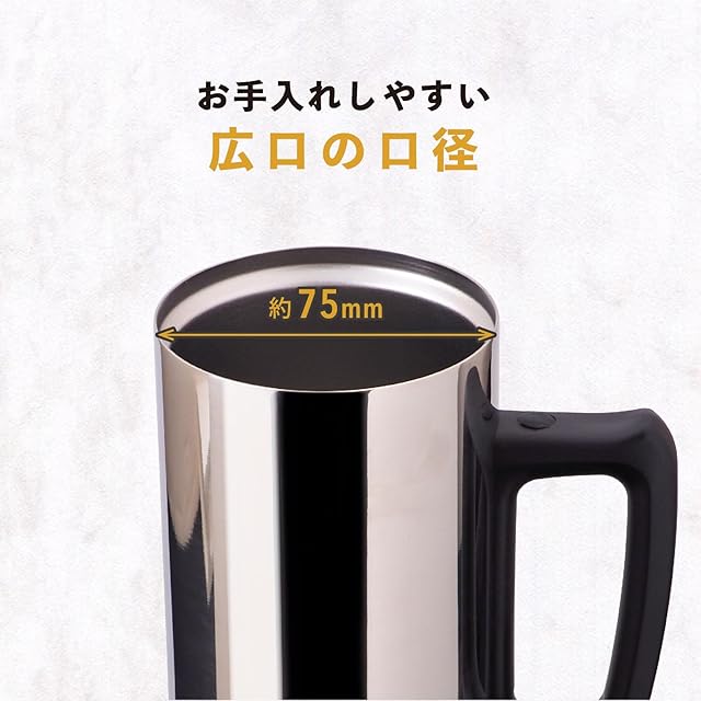 外面を鏡面仕上げにした高級感ある真空断熱構造のビアジョッキ!保冷効果で冷たさが長持ち!大容量サイズの缶ビールがピッタリ注げます。取手も手にフィットするよう設計されてるので非常に持ちやすいです。 保冷だけでなく、保温もOK!外側に熱が伝わりにくいので結露しにくい構造です。