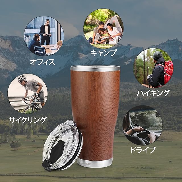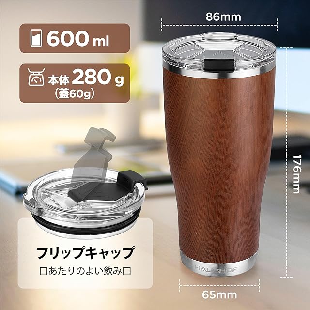 商品名:HAUSHOF タンブラー 蓋付き 600ml 車用タンブラー コーヒーカップ 水筒 マグボトル ステンレス 二重構造 真空断熱 大容量 保温保冷 直飲み アウトドア用 釣り 遠足 登山 キャンプ オフィス ビール コーヒー 直接ドリップ 木目調