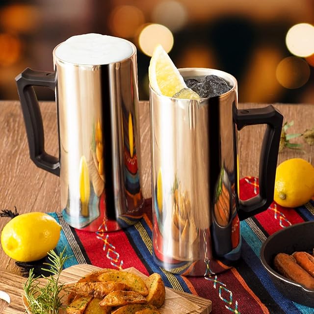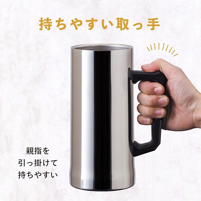 外面を鏡面仕上げにした高級感ある真空断熱構造のビアジョッキ!保冷効果で冷たさが長持ち!氷たっぷり大容量ギガサイズ1.0L。丸みのあるなめらかな飲み口。取手も手にフィットするよう設計されてるので非常に持ちやすいです。 保冷だけでなく、保温もOK!外側に熱が伝わりにくいので結露しにくい構造です。