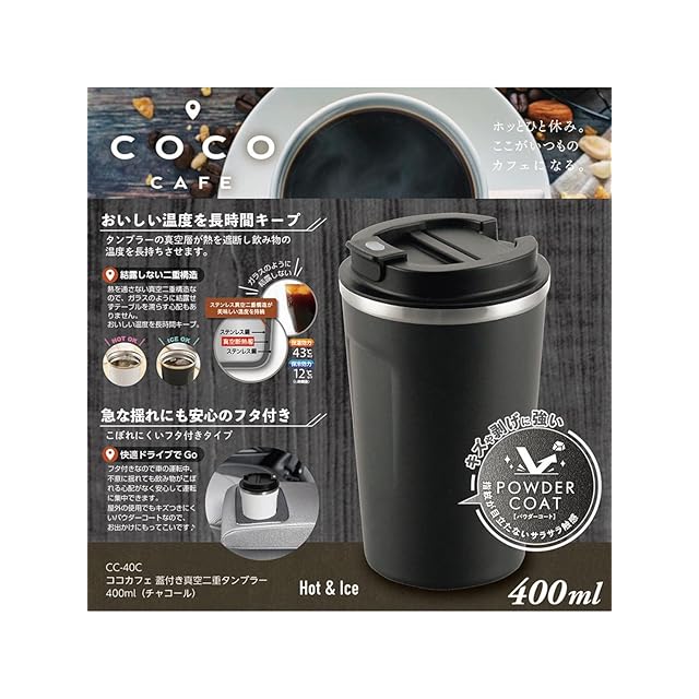 カクセー タンブラー 蓋付き 9cm×14.4cm チャコール 400ml 真空二重 保温 保冷 パウダーコート 傷つきにくい cococafe ココカフェ CC-40C
