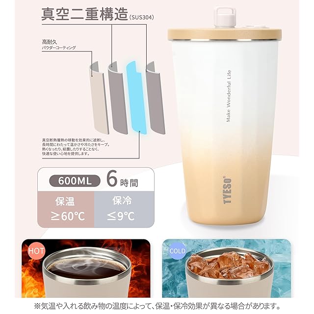 商品名:【SNSで話題】TYESO タンブラー ストロー付き 600ml ステンレス 蓋付き 真空断熱 保温 保冷 アウトドア 持ち運び便利 直飲み 漏れない 大容量 多色 トラベル 2025年アップグレード版