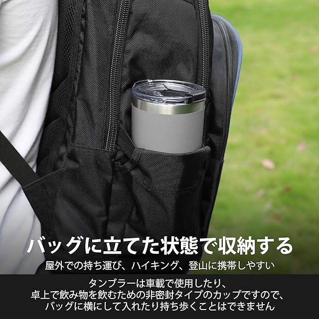 【使用場面】蓋の開閉がスムーズなので、お手入れも簡単!オフィス、自宅、学校、居酒屋などの所で手軽にコーヒーや紅茶などホットあるいはアイスの飲み物を楽しみましょう。注意:タンブラーは車載で使用したり、卓上で飲み物を飲むための非密封タイプのカップですので、バッグに横にして入れたり持ち歩くことはできません。バッグなどに入れる際は、本体を縦置きにしてくださいませ。