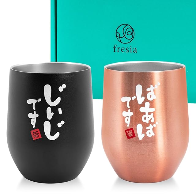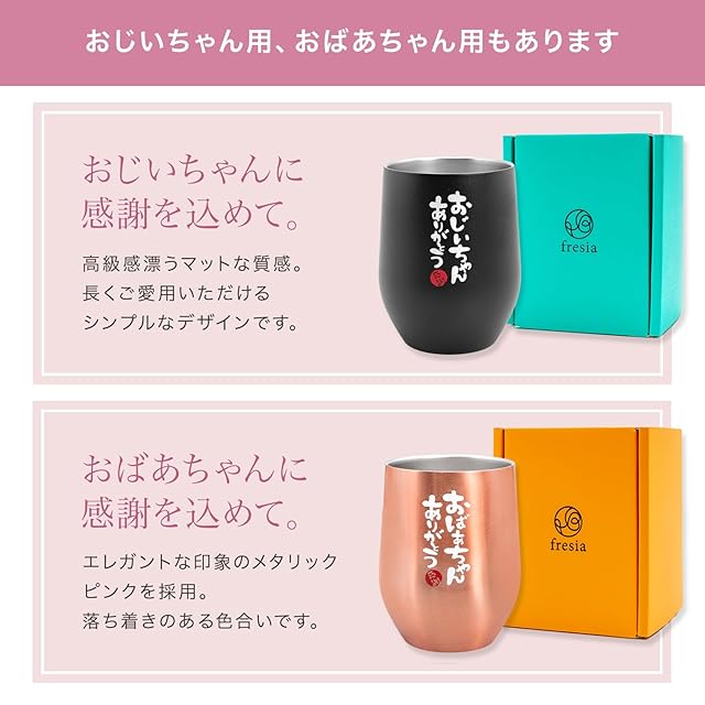 【 敬老の日 の ペア ギフト 】 敬老の日 に おじいちゃん おばあちゃん へ感謝の気持ちを込めて。 孫からもらって喜ぶこと間違いなしの人気のギフトです。手書き風の文字入りで、 お爺ちゃん お祖母ちゃん への感謝の気持ちが伝わるメッセージギフト。シンプルでおしゃれなギフトボックス付き。 【CREA 贈り物バイブルに掲載】 好奇心旺盛な女性のためのこだわりの総合雑誌「CREA」の贈り物バイブル特集に、敬老の日 や 還暦祝い に 人気のプレゼントとして、fresia(フリージア)のタンブラーが掲載されました。 【 真空断熱構造 】 外壁と内壁の間が真空で熱が伝わりにくく保温保冷効果に優れています。 冷たい飲み物は冷たいまま、熱い飲み物は冷めにくく飲みごろの温度を長く保てます。 コーヒーやお酒などの様々なドリンクにお使い頂けます。 【304ステンレス】 高品質の304ステンレス鋼で熱や酸に強くステンレスなので錆びたりせず飲み物の味が変わることはありません。実用性が高く誕生日やお祝いでもらって嬉しいプレゼントとして人気です。 【タンブラー 詳細】 真空断熱 ステンレスタンブラー(約350ml)×2 サイズ:高さ11㎝、直径8.8㎝、飲み口8cm 内容量:350ml 構造:真空二重 素材:304ステンレス オーブン・電子レンジ・食洗器使用不可〈 名入れ 不可 〉 名前入れ や 文字入れ は行っておりませんのでご了承下さい。