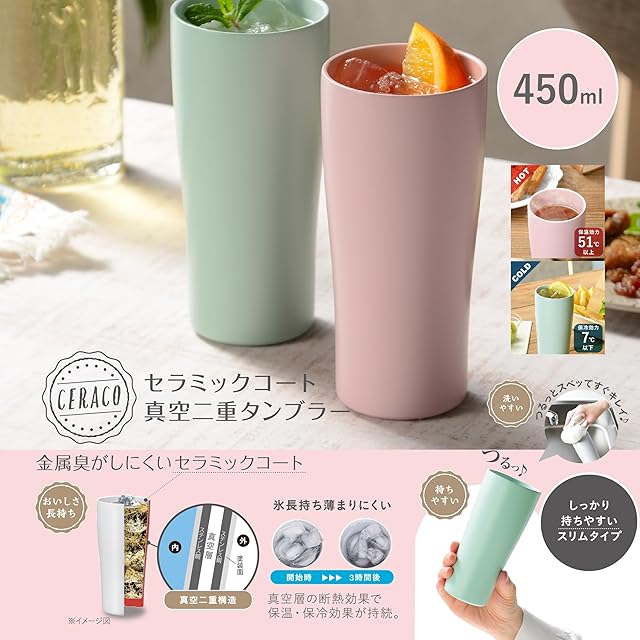 カクセー(Kakusee) タンブラー ピンク 450ml 真空二重構造 保温 保冷 スリムタイプ セラミックコート 洗いやすい セラコ CE-01C