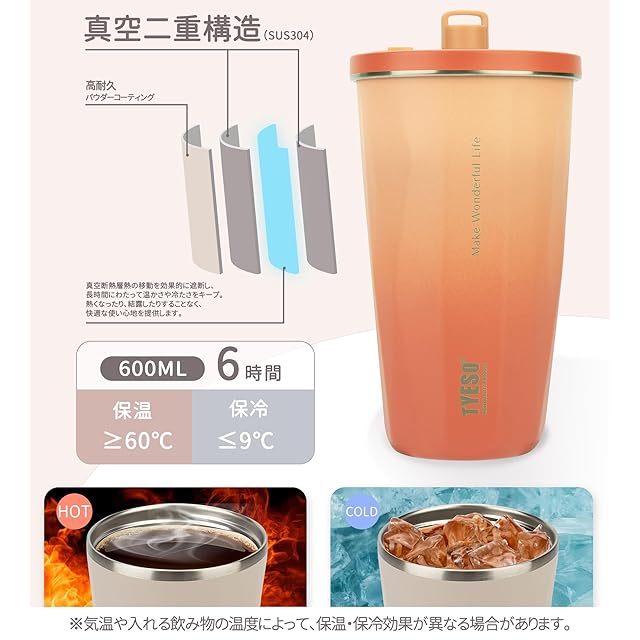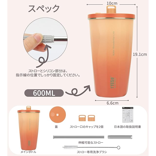 商品名:【SNSで話題】TYESO タンブラー ストロー付き 600ml ステンレス 蓋付き 真空断熱 保温 保冷 アウトドア 持ち運び便利 直飲み 漏れない 大容量 多色 トラベル 2025年アップグレード版