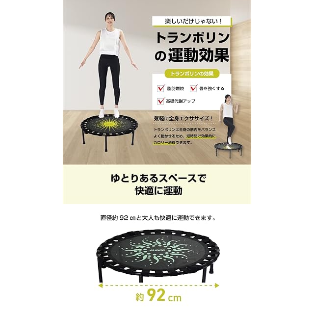 【気軽に全身エクササイズ】トランポリンは全身の筋肉をバランスよく動かせるため、短時間で効果的にカロリーを消費できる運動です。さらに、骨に刺激を与えることで強い骨を作ることができます。テレビを見ながら、音楽を聞きながら、楽しくジャンプエクササイズ可能です。着地面は弾力があり、膝や腰などの痛みが気になる方も、安心して運動できます。