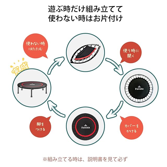 携帯および収納が便利:トランポリンの組み立てと収納は非常に簡単であり、角に収納したり、収納室に折り畳んで収納したりすることができます。これにより、スペースを節約し、持ち運びが容易になります。