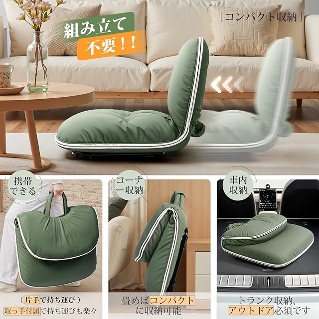 MAZOT 折りたたみ式 座椅子 椅子 2 種類の座り方コンパクト 組立なし 片手で持てる 軽量 収納便利 高・低2段調節 ソファーのような快適さ 革製 汚れに強く 耐久性あり 可愛い オシャレ モダン シンプル リビング アウトドア キャンプ グリーン