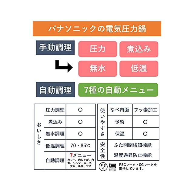 PSCマーク・SGマークを取得しています。PSCマーク:消費生活用製品安全法の家庭用圧力なべおよび圧力がまの安全基準に適合しておいます。SGマーク:製品安全協会が定めたSG基準に合格したことを示し、万一製品欠陥による人身事故が生じた場合、賠償措置がとられます。