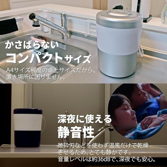 使用方法(1)三角コーナー代わりにバスケットをシンクに置き、生ごみを投入します。(2)バスケットごと本体に入れます。ごみの分別や水切りネットをはずす必要がないため、手を汚さずに清潔にできます。(3)スイッチを押し温風乾燥開始。屋内専用設計のため深夜の運転、臭いも問題ありません。(4)パリパリに乾いた生ごみを水切りネットごと取り出して捨てるだけ。