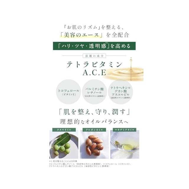 「美容のエース(ビタミンA/C/E)」を全て配合:パルミチン酸レチノール(安定性ビタミンA誘導体)、テトラヘキシルデカン酸アスコルビル(油溶性ビタミンC誘導体)、トコフェロール(ビタミンE)