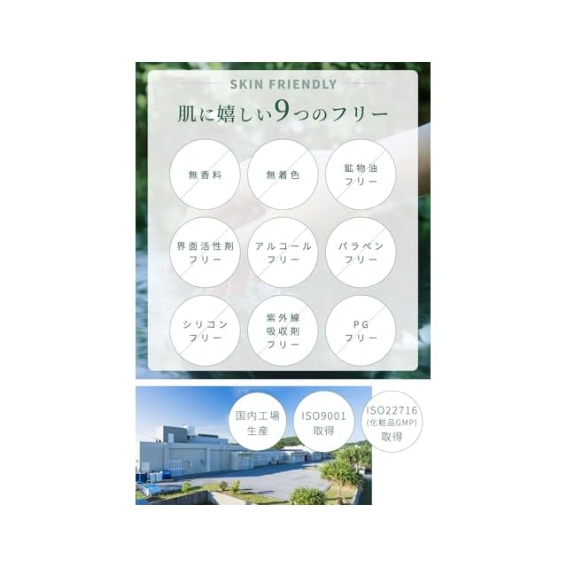 肌に嬉しい9つのフリー:無香料、無着色、鉱物油フリー、界面活性剤フリー、アルコールフリー、パラペンフリー、シリコンフリー、紫外線吸収剤フリー、PGフリー