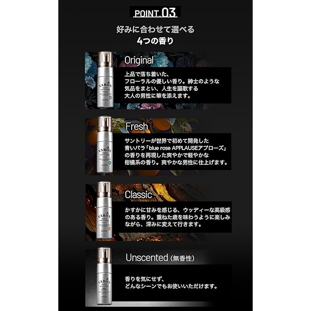 化粧水、美容液、クリームの役割順に3ステップで浸透※するオールインワンスキンケアです。<br> 1本だけの簡単お手入れを続けると、顔の印象は10日間で変えられます。ギトギト、カサカサが気になる大人の男性の肌つやをしっとり整え、すべすべすこやか肌へ。<br> ※角層まで<br> <br> こんな方におすすめです<br> 年齢を重ねても清潔感を保ちたい方<br>顔の表情を明るく保ちたい方<br> 肌の乾燥やベタつきが気になる方<br> 身だしなみとしてスキンケアを行いたい方<br> <br> おすすめする理由1<br> 人生100年時代の男性用オールインワンスキンケア<br> 男性の肌は、女性とくらべて皮脂量が多い一方で水分量が少ないため、べたつきやすく、かさつきやすい傾向があります。また、年齢を重ねていくと、長年のシェービングダメージや日焼けによる紫外線ダメージの蓄積で肌が乾燥しやすくなってしまいます。そんな悩み多き大人の肌をしっとりすこやかな肌へ導くために「VARON」は誕生しました。<br> 化粧水、美容液、クリームの役割順に3ステップでお肌に浸透※するオールインスキンケアです。<br> ※角層まで<br> <br> おすすめする理由2<br> サントリーの独自開発を含む4つの成分を配合<br> 肌荒れを防ぎ、しっとりつや肌へ導くウイスキー樽材エキス※1(サントリー独自開発)、男性特有のギトギト&カサカサをケアするイノシトール※2、肌にハリを与えるアセルヘキサペプチド-8※3、ウーロン茶のポリフェノールパワーを応用していきいきとフレッシュな印象へ導くウーロン茶エキス※4(サントリー独自開発)の4つのこだわりの成分を配合しました。<br> ※1 ヨーロッパナラ木エキス、BG:美容成分(保湿)<br> ※2 イノシトール、BG:美容成分(保湿)<br> ※3 アセチルヘキサペプチド-8、BG:美容成分(保湿)<br> ※4 チャ葉エキス、 BG:美容成分(保湿)<br> <br> おすすめする理由3<br> 紳士の大人肌へ導く独自の3ステップ浸透※技術を採用<br> サントリーは独自の技術「WOW*エマルジョン」で、安定させることが難しかったWOW*(水相・油相・水相)構造を実用化しました。<br> VARONは、他の一般的なオールインワンとは違う、WOW構造を活かした3ステップ浸透※技術で化粧水成分、美容液成分、クリーム成分が役割順に肌へ浸透していくため、1本のお手入れだけで、しっとりとしたすべすべ肌へ導きます。<br> ※角層まで<br> *WOWとは・・・<br> Water in Oil in Waterの略。水と油のように本来は混ざり合わないものを乳化剤を用いて、安定した形で均一に混ぜ合わせ、水相の中に油相、その油相の中にさらに水相が含まれている状態のこと。<br> <br> おすすめする理由4<br> 好みに合わせて選べる香り<br> 毎日つけるものだから、好きな香りで心地よくなりたい。好みに合わせて3つの香りをご用意しました。<br> 人それぞれ趣味趣向があるように、好きな香りも異なります。肌をケアするだけでなく、4つの香りの中から好みの香りを選ぶと気分も高まります。