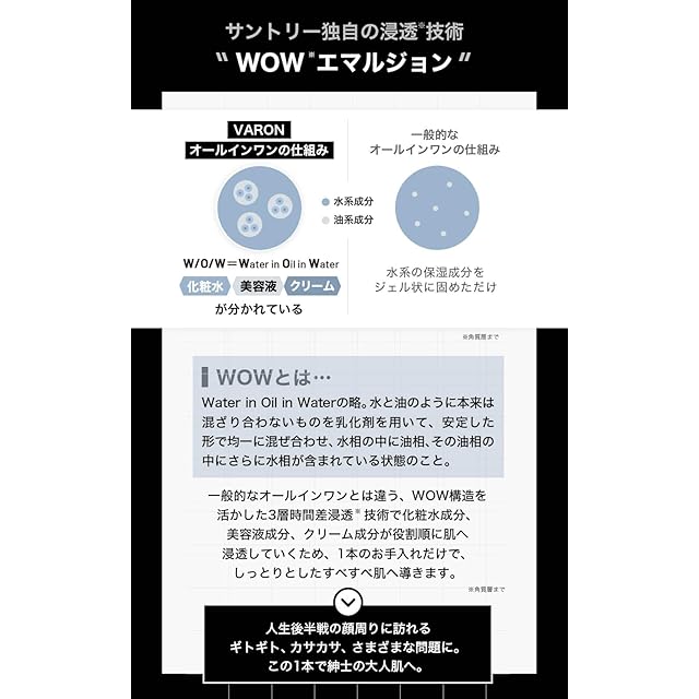 【おすすめする理由3:紳士の大人肌へ導く独自の3層時間差浸透※技術を採用】サントリーは独自の技術「WOW*エマルジョン」で、安定させることが難しかったWOW*(水相・油相・水相)構造を実用化しました。VARONは、他の一般的なオールインワンとは違う、WOW構造を活かした3層時間差浸透※技術で化粧水成分、美容液成分、クリーム成分が役割順に肌へ浸透していくため、1本のお手入れだけで、しっとりとしたすべすべ肌へ導きます。※独自の3層構造により成分を3段階で角層に届けること