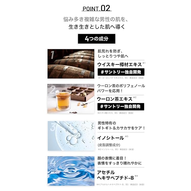 【おすすめする理由2:サントリーの独自開発を含む4つの成分を配合】肌荒れを防ぎ、しっとりつや肌へ導くウイスキー樽材エキス※1(サントリー独自開発)、男性特有のギトギト&カサカサをケアするイノシトール※2、肌にハリを与えるアセルヘキサペプチド-8※3、ウーロン茶のポリフェノールパワーを応用していきいきとフレッシュな印象へ導くウーロン茶エキス※4(サントリー独自開発)の4つのこだわりの成分を配合しました。※1 ヨーロッパナラ木エキス、BG:美容成分(保湿)※2 イノシトール、BG:美容成分(保湿)※3 アセチルヘキサペプチド-8、BG:美容成分(保湿)※4 チャ葉エキス、 BG:美容成分(保湿)