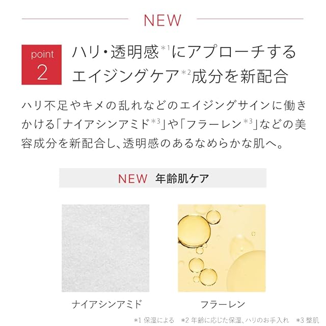 【年齢肌ケア成分】エイジングサインに働きかける「ナイアシンアミド」や「フラーレン」などの美容成分を配合。大人の毛穴悩みにアプローチしながら、なめらかな肌へと導きます。