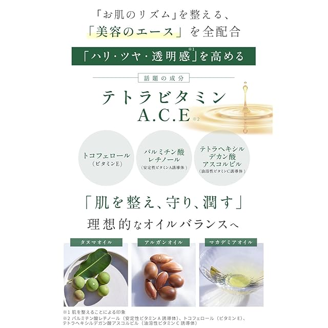 「美容のエース(ビタミンA/C/E)」を全て配合:パルミチン酸レチノール(安定性ビタミンA誘導体)、テトラヘキシルデカン酸アスコルビル(油溶性ビタミンC誘導体)、トコフェロール(ビタミンE)