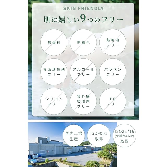 肌に嬉しい9つのフリー:無香料、無着色、鉱物油フリー、界面活性剤フリー、アルコールフリー、パラペンフリー、シリコンフリー、紫外線吸収剤フリー、PGフリー
