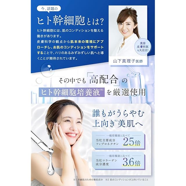 今、大注目!美容皮膚科医も大注目の高純度ヒト幹細胞培養液を厳選配合。皮膚科学から生まれた次世代スキンケアを体感して下さい。ヒト幹細胞エキスとの相性が良い整肌成分 EGF、FGF、ナノカプセル加工馬プラセンタを贅沢に配合しています。