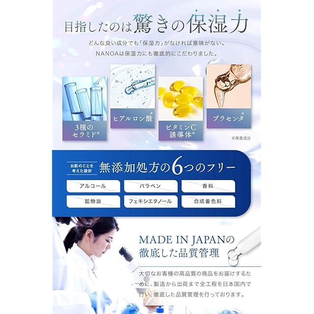 成分が良くても保湿力がなければ意味がない。3種のセラミド、ヒアルロン酸、ビタミンC誘導体、プラセンタを配合し、NANOAは理想的な保湿力にこだわりました。