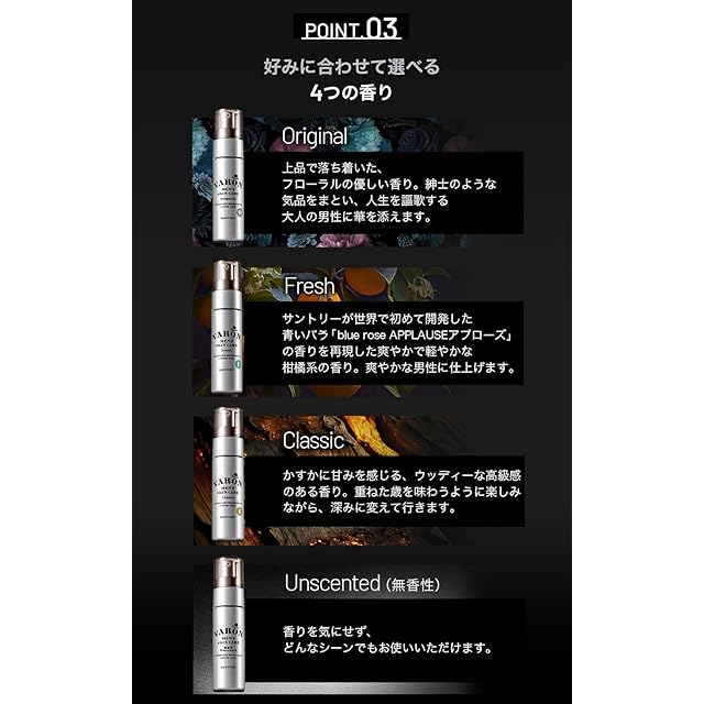 化粧水、美容液、クリームの役割順に3ステップで浸透※するオールインワンスキンケアです。<br> 1本だけの簡単お手入れを続けると、顔の印象は10日間で変えられます。ギトギト、カサカサが気になる大人の男性の肌つやをしっとり整え、すべすべすこやか肌へ。<br> ※角層まで<br> <br> こんな方におすすめです<br> 年齢を重ねても清潔感を保ちたい方<br>顔の表情を明るく保ちたい方<br> 肌の乾燥やベタつきが気になる方<br> 身だしなみとしてスキンケアを行いたい方<br> <br> おすすめする理由1<br> 人生100年時代の男性用オールインワンスキンケア<br> 男性の肌は、女性とくらべて皮脂量が多い一方で水分量が少ないため、べたつきやすく、かさつきやすい傾向があります。また、年齢を重ねていくと、長年のシェービングダメージや日焼けによる紫外線ダメージの蓄積で肌が乾燥しやすくなってしまいます。そんな悩み多き大人の肌をしっとりすこやかな肌へ導くために「VARON」は誕生しました。<br> 化粧水、美容液、クリームの役割順に3ステップでお肌に浸透※するオールインスキンケアです。<br> ※角層まで<br> <br> おすすめする理由2<br> サントリーの独自開発を含む4つの成分を配合<br> 肌荒れを防ぎ、しっとりつや肌へ導くウイスキー樽材エキス※1(サントリー独自開発)、男性特有のギトギト&カサカサをケアするイノシトール※2、肌にハリを与えるアセルヘキサペプチド-8※3、ウーロン茶のポリフェノールパワーを応用していきいきとフレッシュな印象へ導くウーロン茶エキス※4(サントリー独自開発)の4つのこだわりの成分を配合しました。<br> ※1 ヨーロッパナラ木エキス、BG:美容成分(保湿)<br> ※2 イノシトール、BG:美容成分(保湿)<br> ※3 アセチルヘキサペプチド-8、BG:美容成分(保湿)<br> ※4 チャ葉エキス、 BG:美容成分(保湿)<br> <br> おすすめする理由3<br> 紳士の大人肌へ導く独自の3ステップ浸透※技術を採用<br> サントリーは独自の技術「WOW*エマルジョン」で、安定させることが難しかったWOW*(水相・油相・水相)構造を実用化しました。<br> VARONは、他の一般的なオールインワンとは違う、WOW構造を活かした3ステップ浸透※技術で化粧水成分、美容液成分、クリーム成分が役割順に肌へ浸透していくため、1本のお手入れだけで、しっとりとしたすべすべ肌へ導きます。<br> ※角層まで<br> *WOWとは・・・<br> Water in Oil in Waterの略。水と油のように本来は混ざり合わないものを乳化剤を用いて、安定した形で均一に混ぜ合わせ、水相の中に油相、その油相の中にさらに水相が含まれている状態のこと。<br> <br> おすすめする理由4<br> 好みに合わせて選べる香り<br> 毎日つけるものだから、好きな香りで心地よくなりたい。好みに合わせて3つの香りをご用意しました。<br> 人それぞれ趣味趣向があるように、好きな香りも異なります。肌をケアするだけでなく、4つの香りの中から好みの香りを選ぶと気分も高まります。