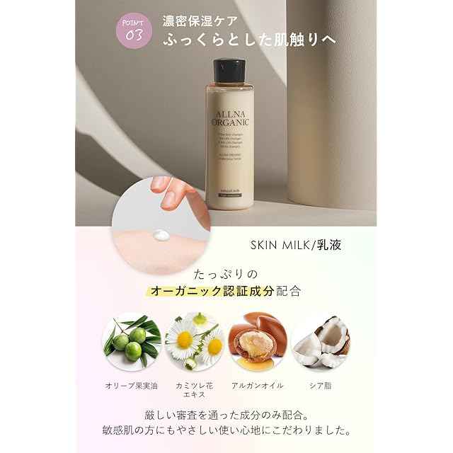 ✅【 乳液 150ml 】たっぷりのオーガニックな保湿成分を配合しました。濃密保湿ケアでふっくらとした肌触りへ導きます。