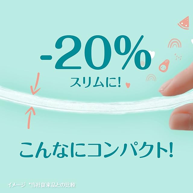 コンパクトの秘密はパンパース史上初 -20%スリム吸収体*。だからかさばらず持ち運びに便利 *当社従来品との比較