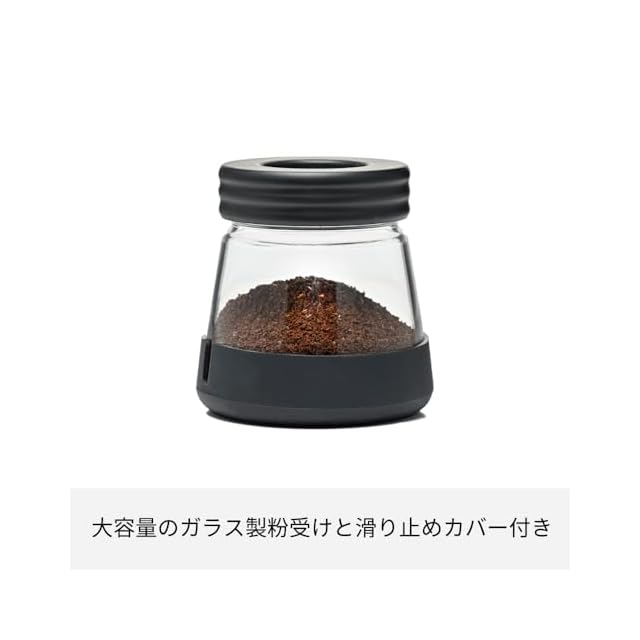 【滑り止めカバー付き】大容量のガラス製粉受けと滑り止めカバー付きです。100gまでのコーヒー粉をいれることができる、大容量の粉受けを使用したコーヒーミルです。滑り止めカバー付きなので安定してコーヒーを挽くことができます。