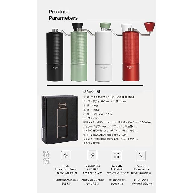 1.ブランド:TIMEMORE 型番:栗子C3S 素材:アルミ金属+ステンレス(全金属) 刃:ステンレス サイズ:本体147x52mm