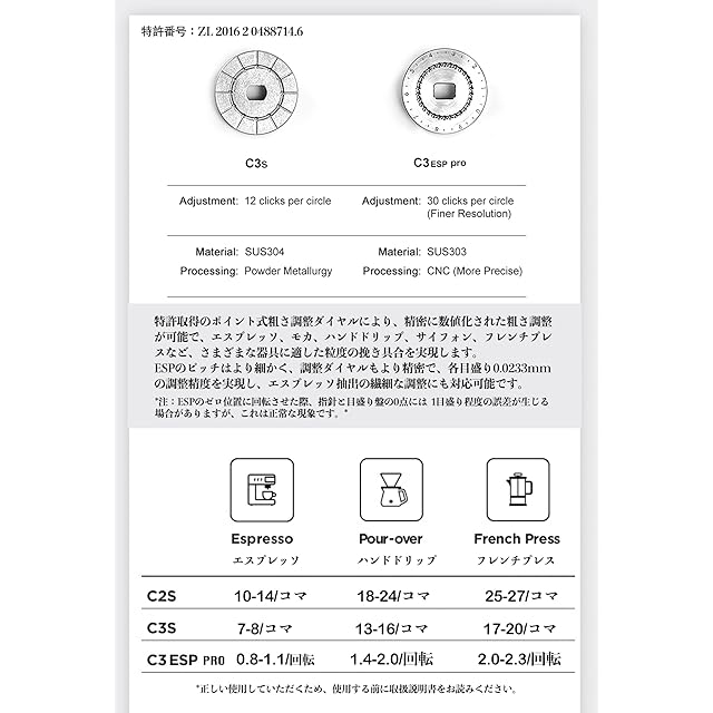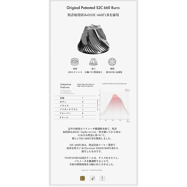 切れ味の良い刃| S2C (Spike to Cut/突き刺してから切る) という新規設計の臼刃です。CNC加工で特許があるS2C660のステレス臼刃は均一な挽目を実現し、微粉の発生量も最小限に抑えて、豆の味を損ないません。