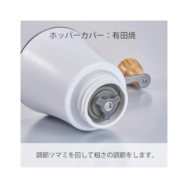 【商品詳細】本体サイズ:幅16.7×奥行8.5×高さ21.5cm、本体重量:635g、本体材質:ホッパーカバー/磁器、臼/セラミック、フタ・シャフト・スプリングハンドル/ステンレス、ホッパー/ポリプロピレン、臼座・調節ツマミ・ワッシャー/ナイロン、フタパッキン・上パッキン・下パッキン/シリコーンゴム、本体・ハンドルツマミ/オリーブウッド